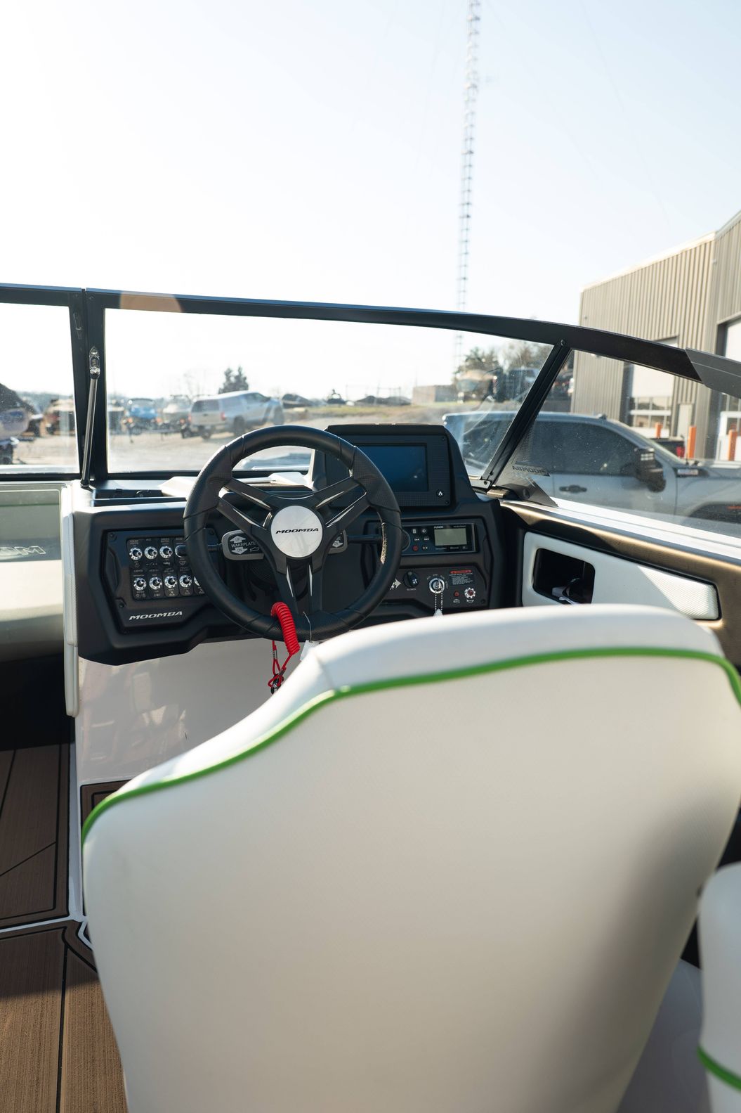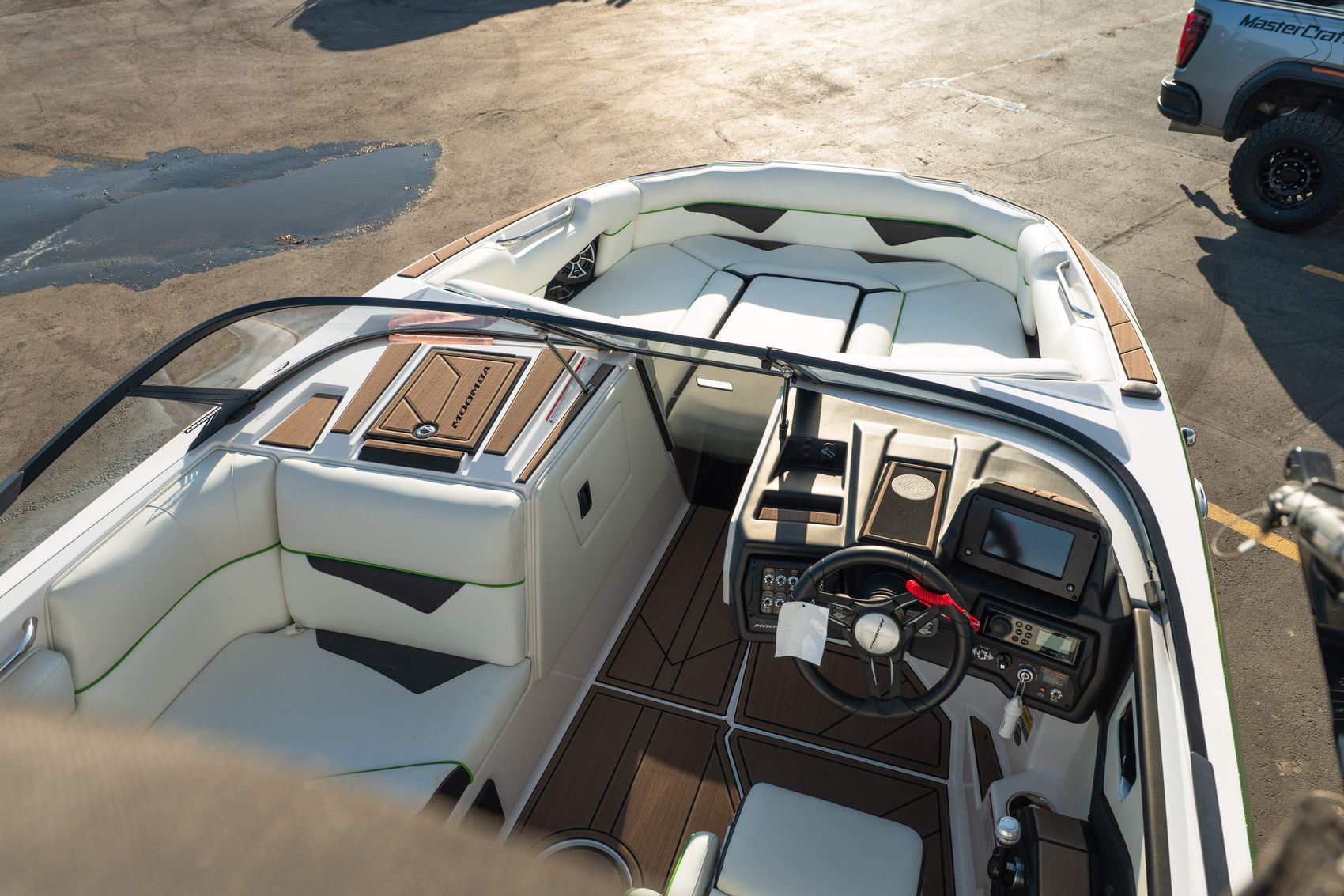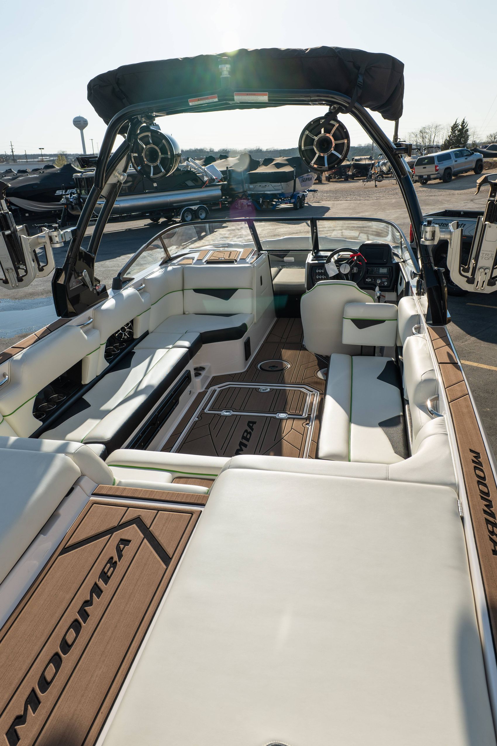 Finished in a standout Kiwi Green Metal Flake, White, and Black color combination, this Makai has a bold look and is loaded with desirable options including the Flow 3 Surf System with 6 pumps, Premium Wet Sounds stereo package with bow speakers, subwoofer, and Rev 10 tower speakers, premium PRO tower bimini with folding arms and surf storage, swivel wakeboard rack upgrade, underwater lights, heater, dual battery setup with charger, PTM extended mirror, Zero Off GPS cruise, GatorStep floor and deck kit, walk-thru screen, full boat cover, and swim platform cover. This is a sharp, one-owner Makai with low hours and an excellent setup for wakeboarding, surfing, or cruising.